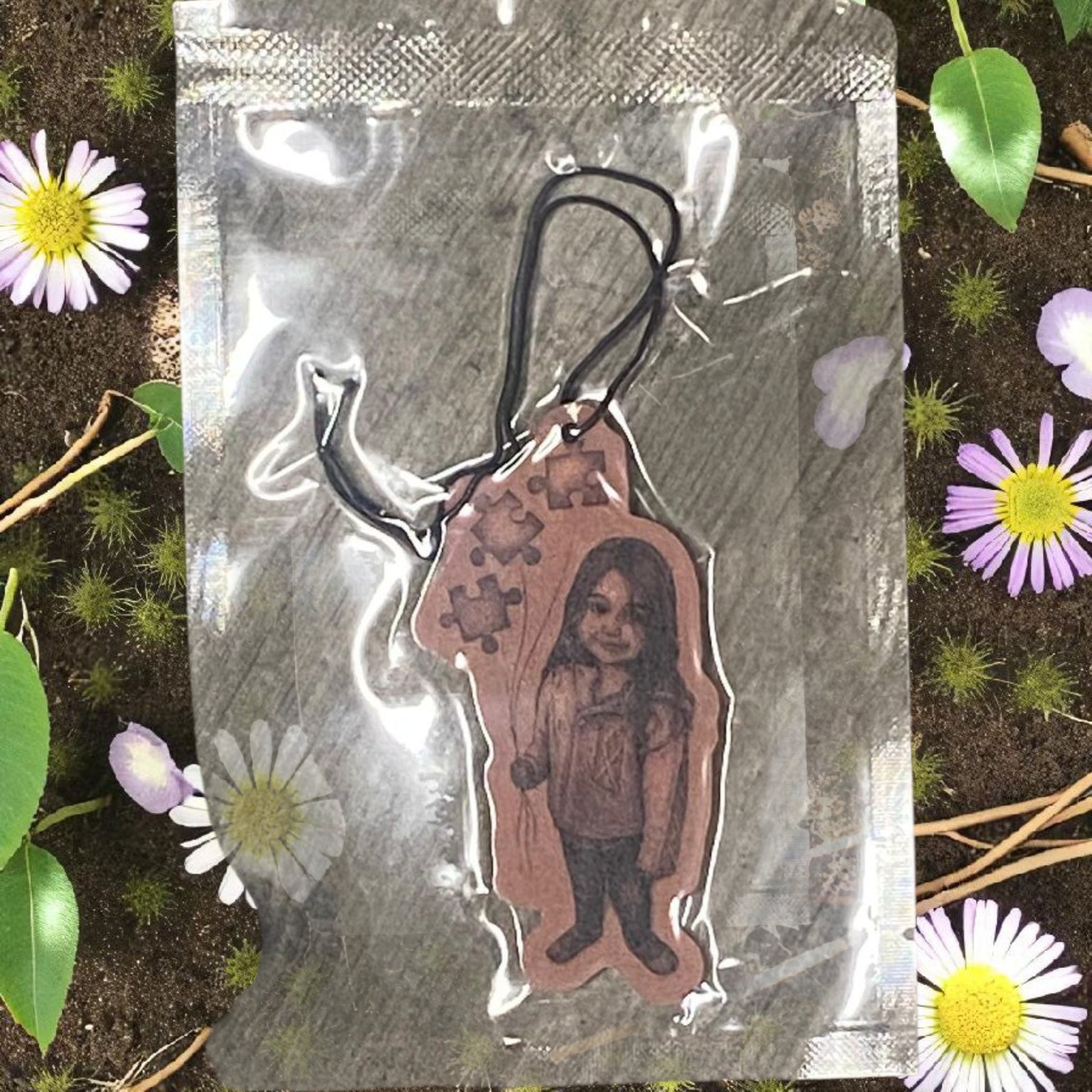 “Ambientador de coche solidario con la silueta de Irene. Un aroma que acompaña cada viaje y un diseño que transmite esperanza, recordándonos que juntos sumamos kilómetros de amor y apoyo para sus terapias. 💙”